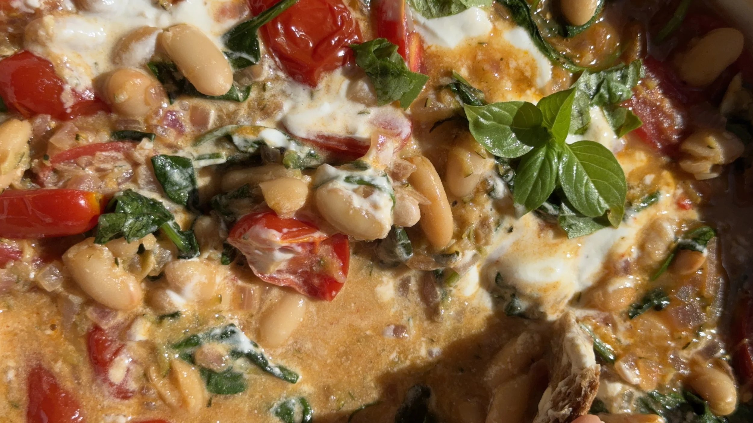 mix through the beans & tomatoes, pouring over the the bone broth